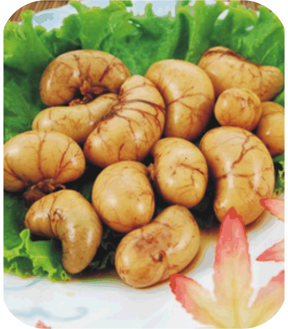 以獨門配方之中藥材燉滷,色澤成金黃色,冷卻後皮Q、筋脆、骨香,膠質含量高且低膽固醇,蕃薯市雞腳凍招牌商品。